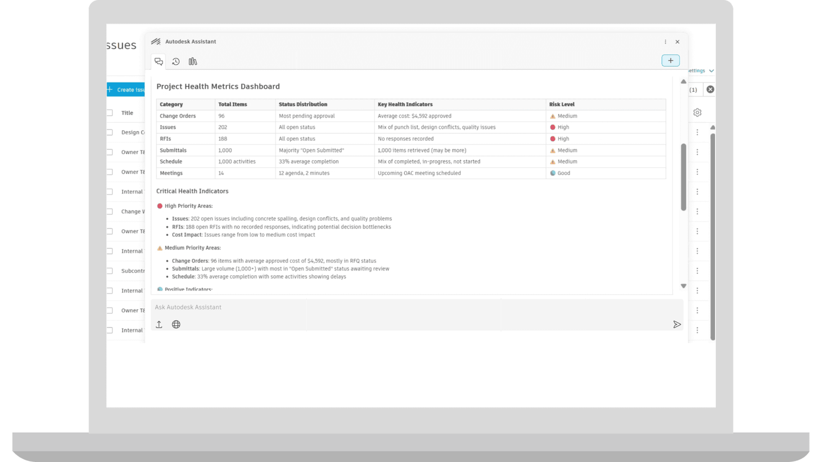 Мабуть, найважливіша новина місяця: агент Project Data в Autodesk Assistant виходить із бети та стає загальнодоступним. Він вбудований безпосередньо в платформу і дозволяє командам миттєво отримувати аналітику по проекту, автоматизувати рутинні завдання та зосереджуватися на тому, що дійсно важливо. Це не просто чат-бот — це інструмент, що реально допомагає організовувати робочий процес прямо всередині платформи.